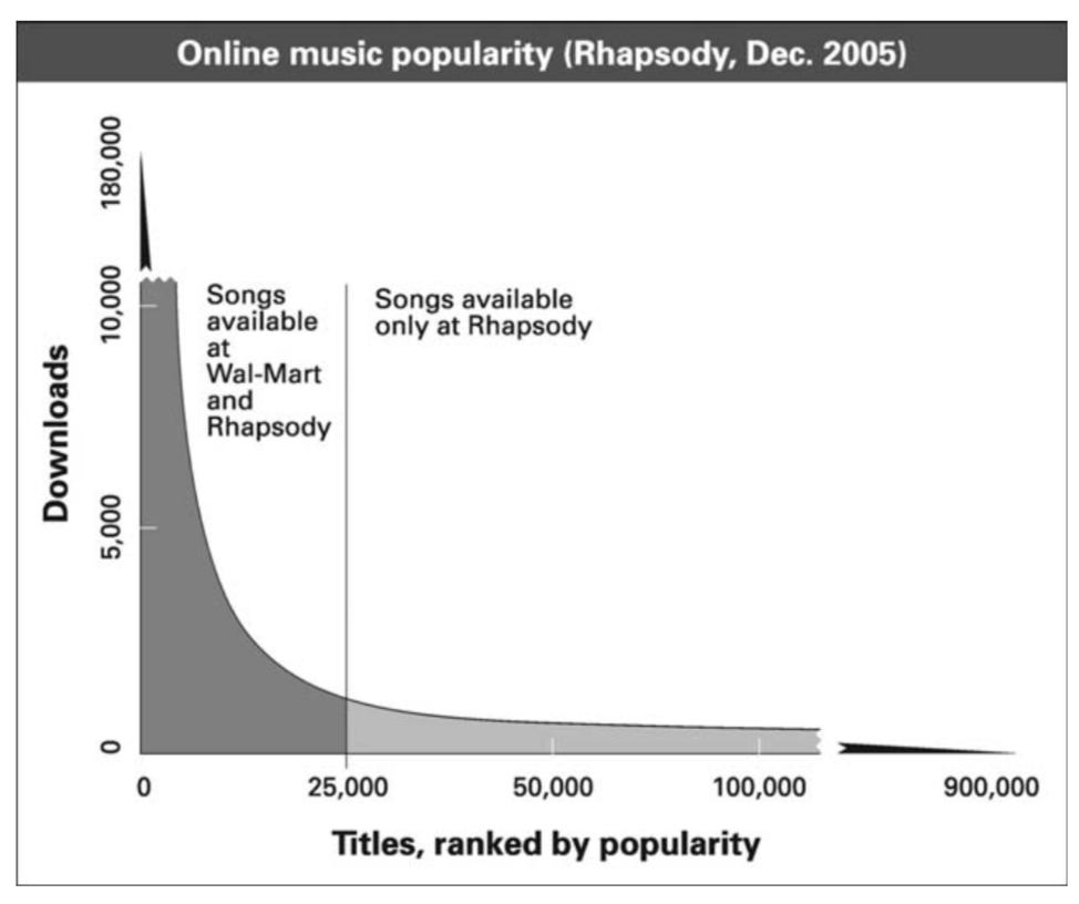 If you ranked music tracks by popularity you get a curve that looks like the above. Walmart, a physical retailer, has to cut off their inventory at some point (usually around the “head”). Rhapsody, an online music store (that was popular when Anderson wrote the book) can offer a much larger catalog (the “long tail”).
